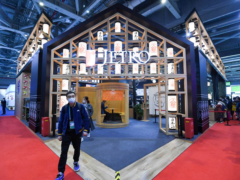 11月10日,观众从第三届进博会食品及农产品展区日本贸易振兴机构展台走出。新华社记者 陈晔华 摄
