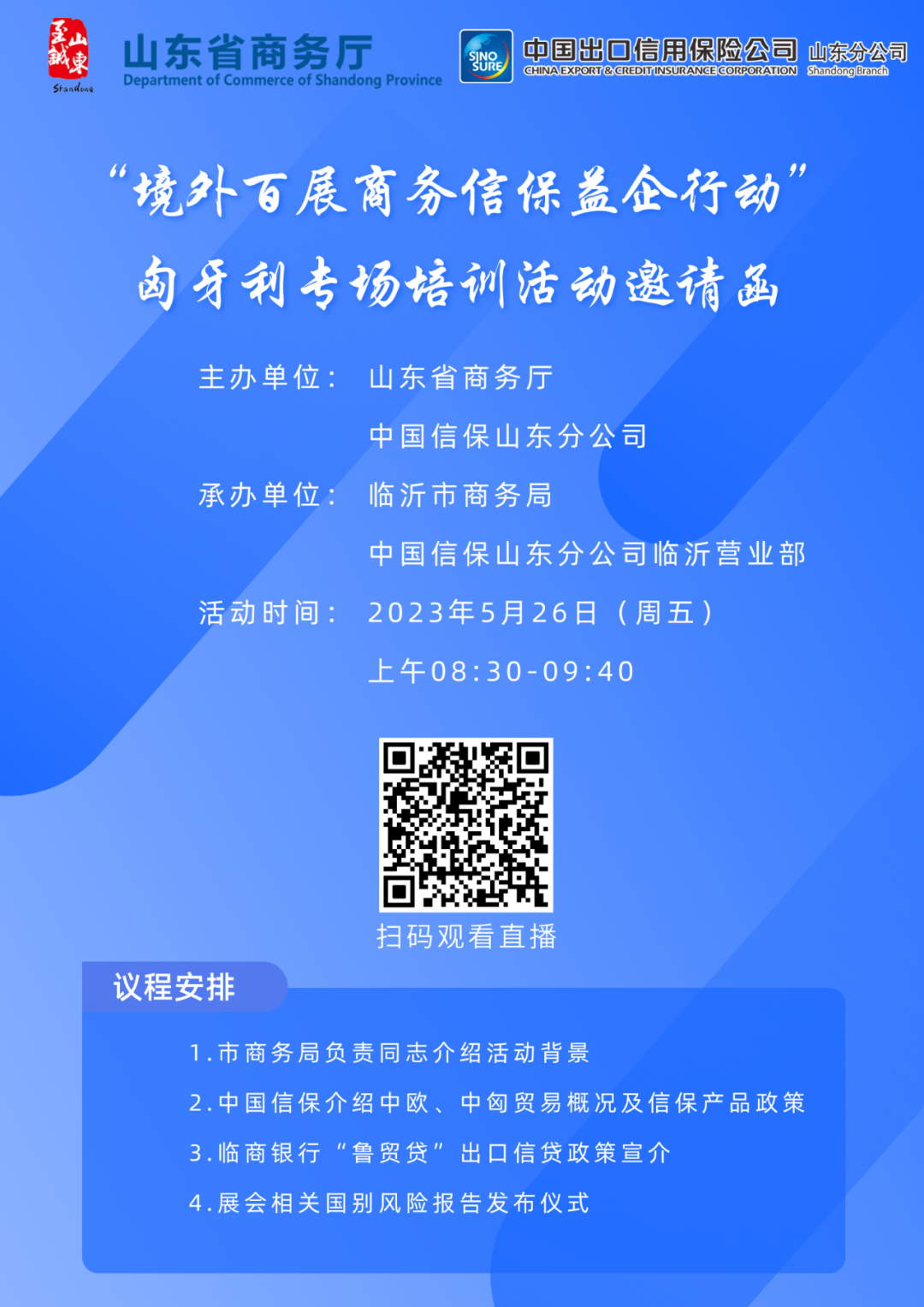 为深入贯彻落实省委、省政府稳外贸部署要求,扎实助力我省包括我市企业抢订单、拓市场,省商务厅和中国信保山东分公司拟联合开展“境外百展商务信保益企行动”,帮助企业用足用好商务惠企政策和出口信用保险工具,省商务厅和中国信保山东分公司面向全省举办“境外百展商务信保益企行动”系列培训活动,活动结合我省境外百展10个主办类展会和和我市重点类展会,本场活动为“匈牙利专场”。